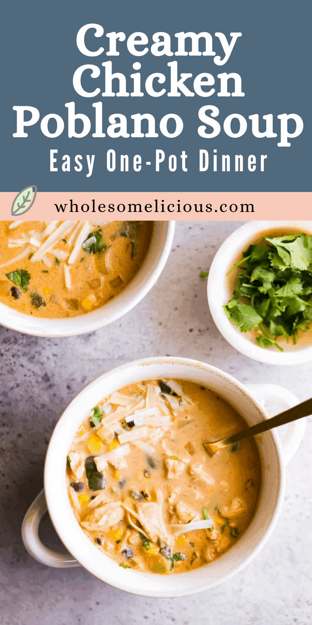 This Creamy Chicken Poblano Soup is my Wholesomelicious-inspired take on that mountain favorite. It’s hearty without being heavy, loaded with protein and fiber, and has just enough heat to keep things interesting—without overpowering the dish. As a nutritionist, these are exactly the balanced recipes I love making at home! Poblano peppers are the star here. They’re mild, slightly smoky, and add depth without a ton of spice. Paired with tender seasoned chicken, sweet corn, and black beans, the flavors balance beautifully.