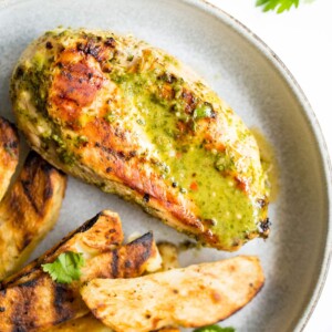 Fire up the grill, call all of your friends over, and enjoy an evening outside eating this delicious Grilled Chicmichurri Chicken! You’ll love the fresh herb chimichurri sauce that comes together so easily with just a few ingredients. The addition of grilled potatoes is icing on the cake! It’s one of those dishes that makes you want to fire up the grill and keep dinner light, easy, and delicious.
