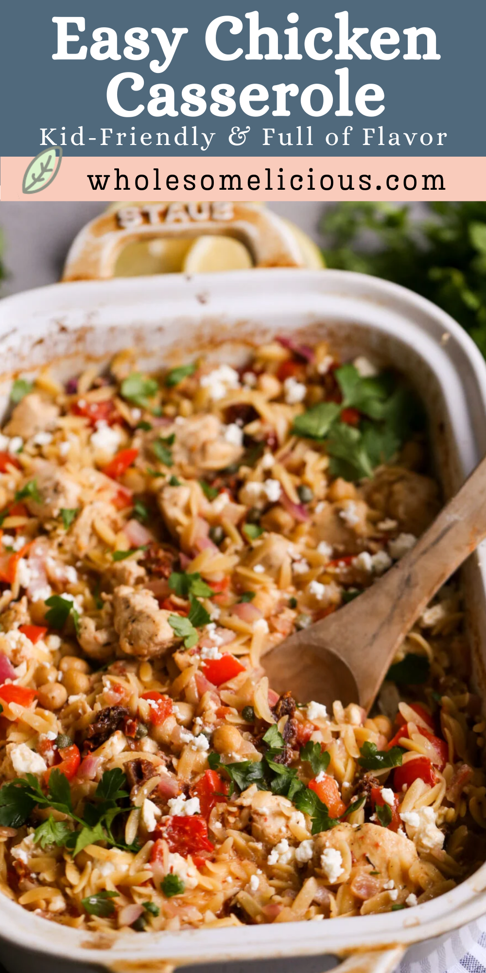 This Mediterranean Chicken Orzo Casserole is a healthy one-pan dinner with chickpeas, veggies, lemon, and feta. Easy, protein-packed, and perfect for weeknights.