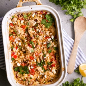 If you’re looking for a healthy, fresh, and easy weeknight dinner, this Mediterranean Chicken Orzo Casserole with Chickpeas checks every box. It’s a one-pan casserole packed with juicy chicken, tender orzo, fresh veggies, lemon, herbs, and a sprinkle of feta. Everything cooks together in one dish, including the raw chicken, making this a simple, hands-off recipe that your whole family will love!