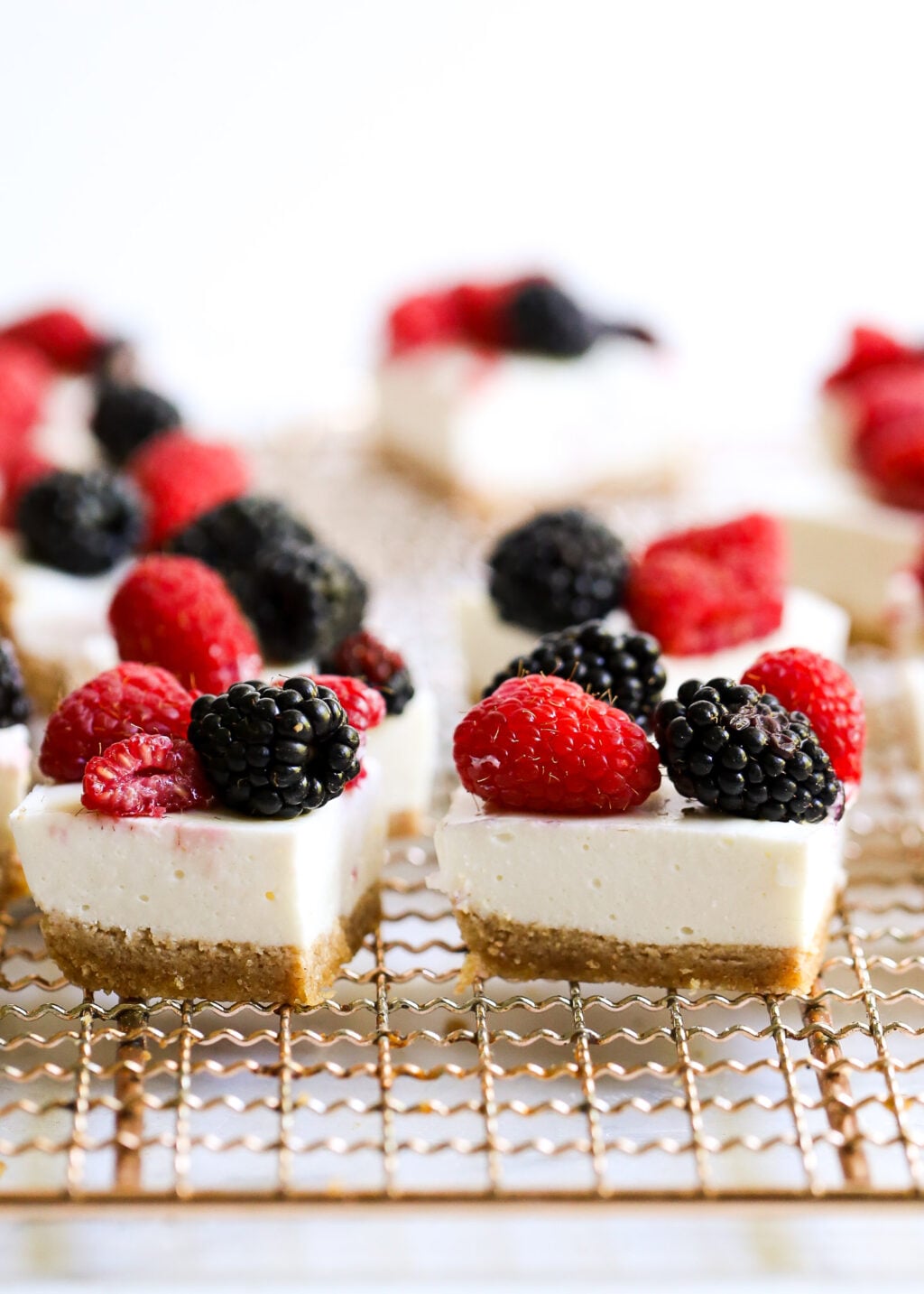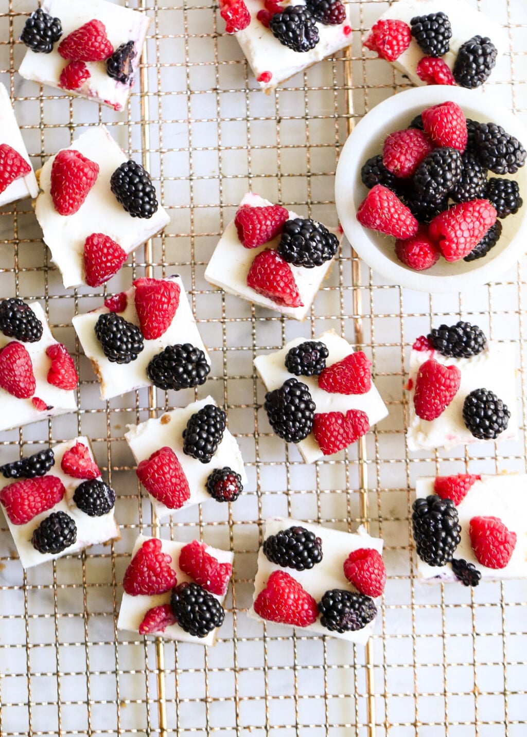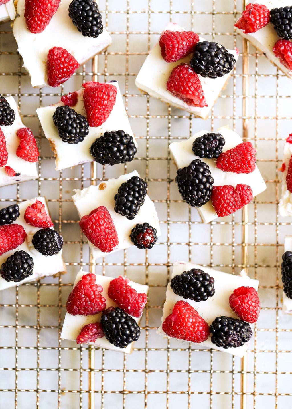 - Top with berries and slice into 16 squares (or 9 squares if you want them bigger). Store in the fridge for up to 1 week.