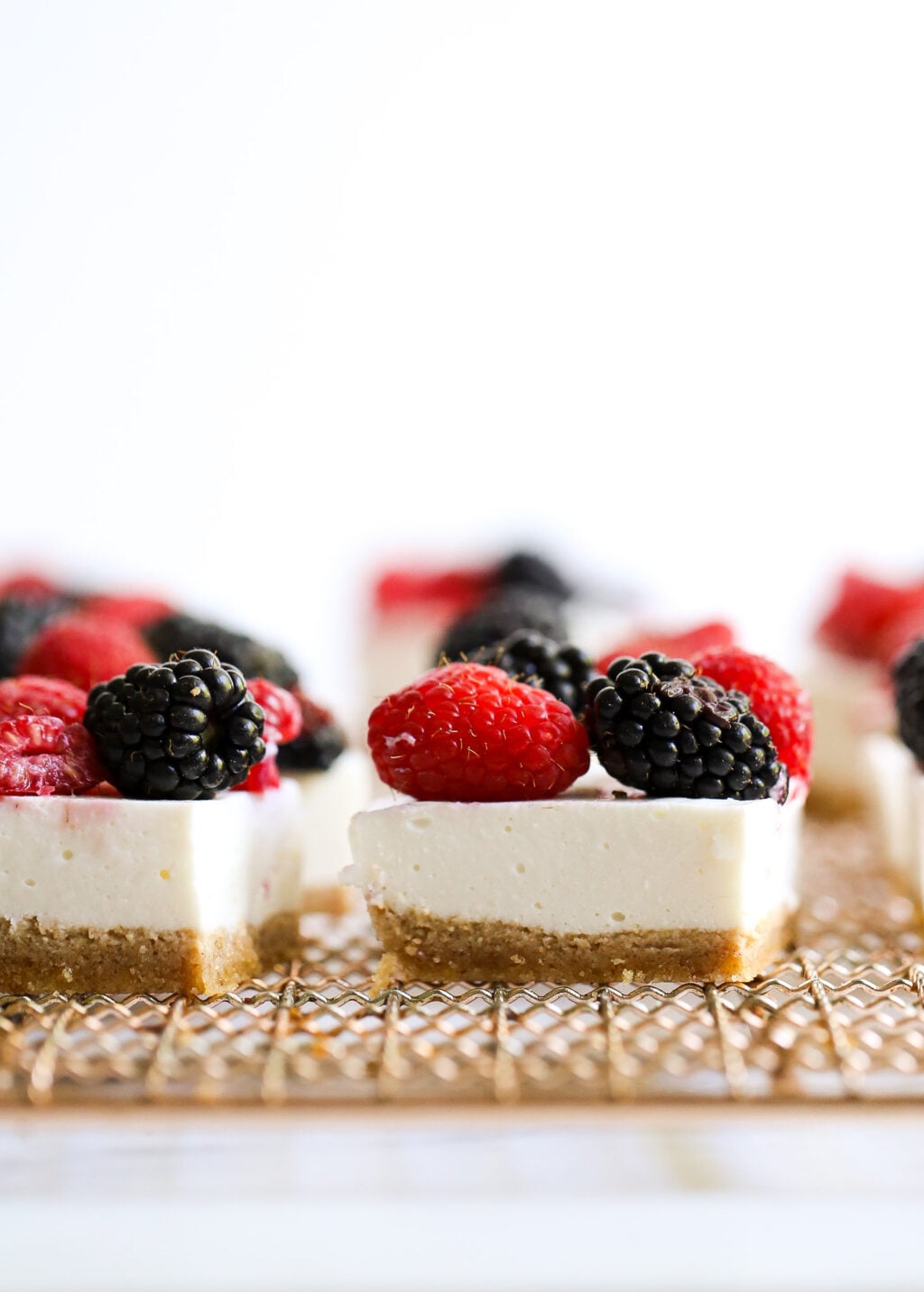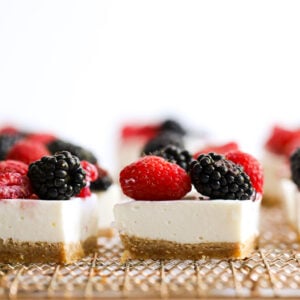 The process is simple: bake the crust, blend the filling, pour, refrigerate, and top with berries right before serving. This dessert recipe is hands-off while everything sets in the fridge, making it ideal for making the night before a gathering, a holiday brunch, or just because you want something beautiful waiting for you in the refrigerator. Sound good? Let’s make them!