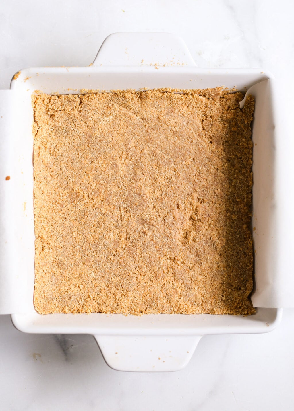 - Make the crust. Combine graham cracker crumbs, melted butter, sugar, and a pinch of salt until the mixture feels like wet sand. Press firmly and evenly into the bottom of your pan using the back of a flat-bottomed measuring cup.