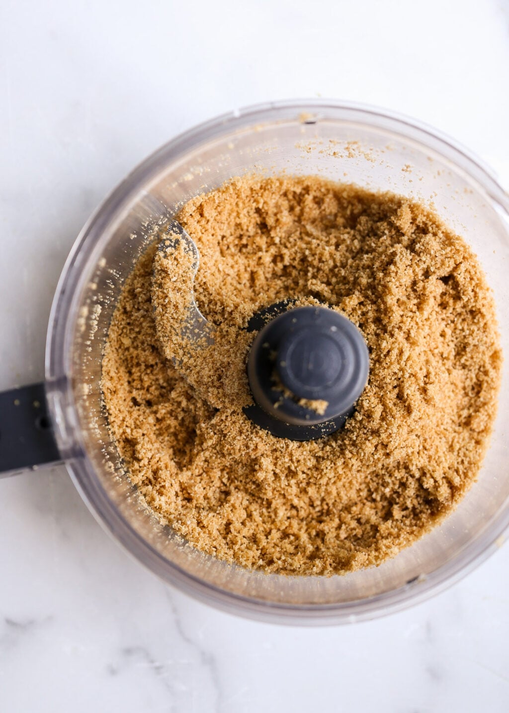 - Make the graham cracker crust: In a food processor, combine graham crackers, melted butter, sugar, and a pinch of sea salt. Mix until the crumbs are evenly moistened and hold together when you press between your fingertips. It should feel like wet sand. Press firmly and evenly into the bottom of the prepared pan and flatten.