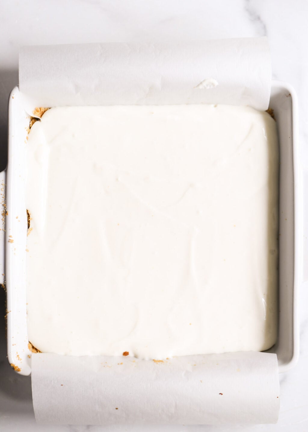 - Fill and refrigerate. Pour the filling evenly over the cooled crust. Tap the pan gently on the counter to release any air bubbles and smooth the top with a spatula. Refrigerate for at least 4 hours or overnight until completely set.